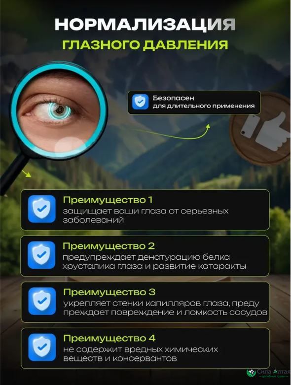 Две капсулы — лютеиновая и гидрофильная — действуют синергично: улучшают микроциркуляцию, питание зрительного нерва и нормализуют внутриглазное давление, помогая при глаукоме и катаракте.