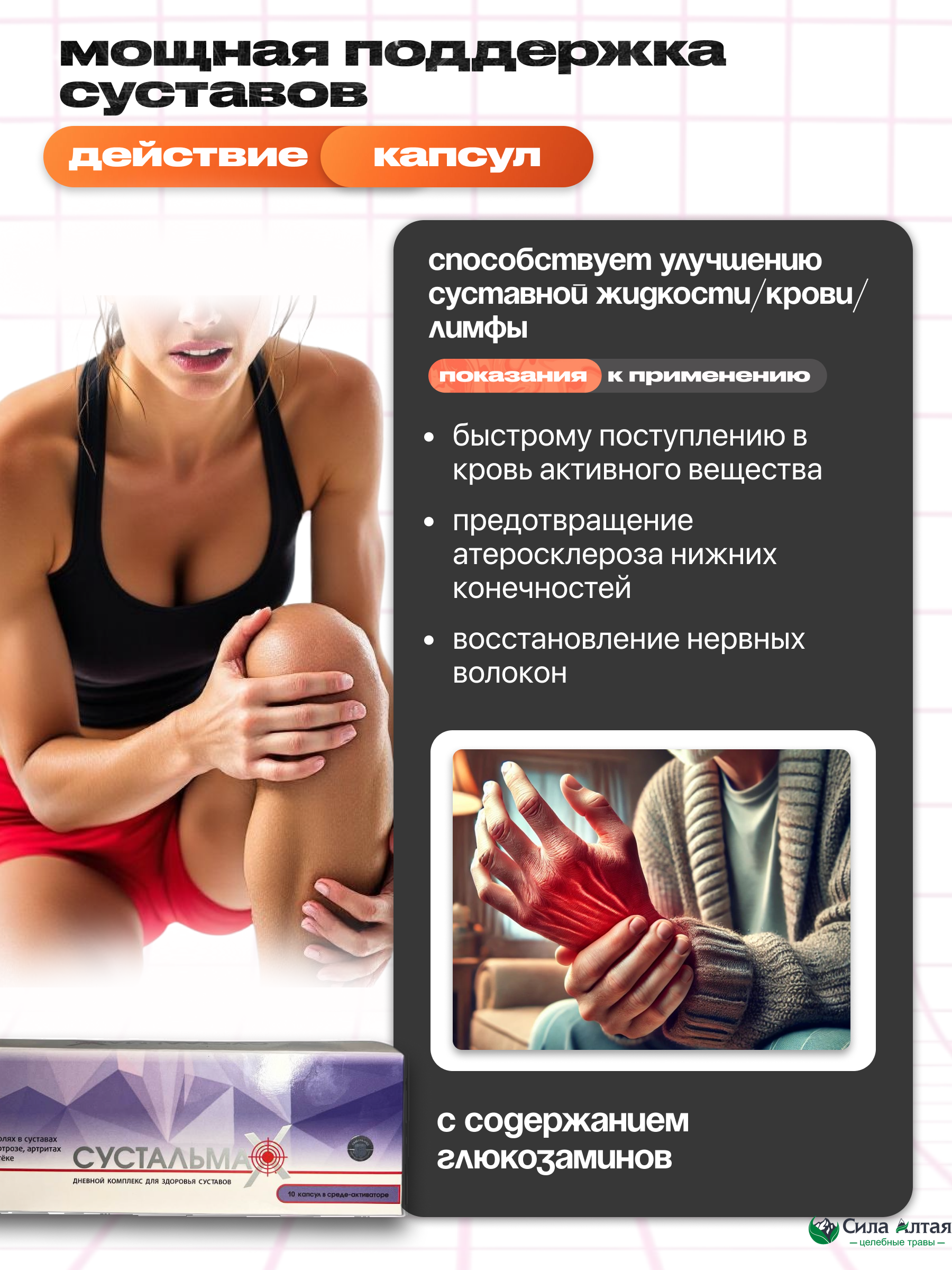 Сустальмакс оказывает положительное влияние на костно-мышечную систему, соединительную ткань и сосудистый тонус, обеспечивая комплексную поддержку суставов при хронических и возрастных изменениях.